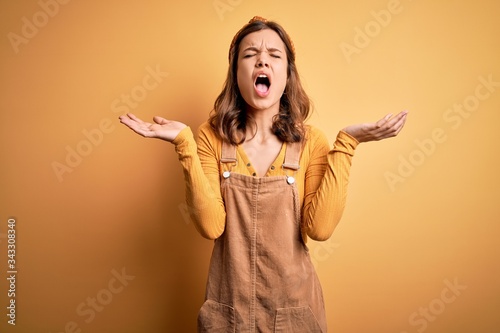 Young beautiful blonde girl wearing overall standing over yellow isolated background celebrating mad and crazy for success with arms raised and closed eyes screaming excited. Winner concept