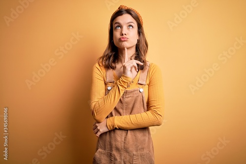 Young beautiful blonde girl wearing overall standing over yellow isolated background Thinking concentrated about doubt with finger on chin and looking up wondering
