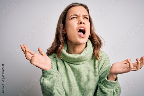 Young beautiful blonde girl wearing winter sweater standing over isolated background crazy and mad shouting and yelling with aggressive expression and arms raised. Frustration concept.