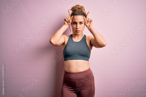 Young beautiful blonde sportswoman doing sport wearing sportswear over pink background doing funny gesture with finger over head as bull horns