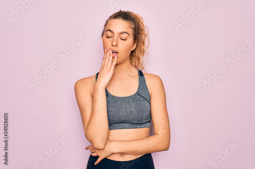 Young beautiful blonde sportswoman with blue eyes doing exercise wearing sportswear bored yawning tired covering mouth with hand. Restless and sleepiness.