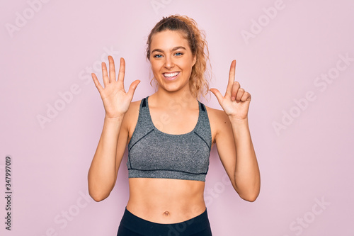 Young beautiful blonde sportswoman with blue eyes doing exercise wearing sportswear showing and pointing up with fingers number seven while smiling confident and happy.