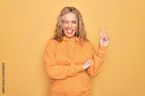 Young beautiful blonde sporty woman wearing casual sweatshirt over yellow background smiling with happy face winking at the camera doing victory sign with fingers. Number two.
