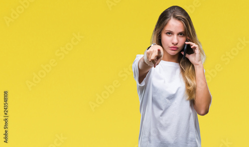 Young beautiful blonde woman calling using smartphone over isolated background pointing with finger to the camera and to you, hand sign, positive and confident gesture from the front
