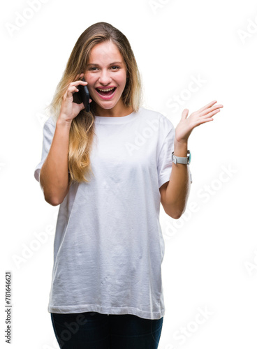 Young beautiful blonde woman calling using smartphone over isolated background very happy and excited, winner expression celebrating victory screaming with big smile and raised hands