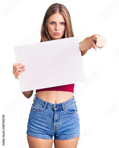 Young beautiful blonde woman holding blank empty banner pointing with finger to the camera and to you, confident gesture looking serious