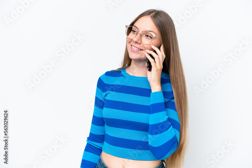 Young beautiful blonde woman isolated on white background keeping a conversation with the mobile phone with someone