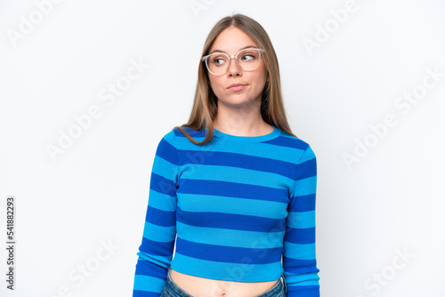 Young beautiful blonde woman isolated on white background making doubts gesture looking side