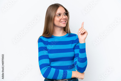Young beautiful blonde woman isolated on white background pointing up a great idea