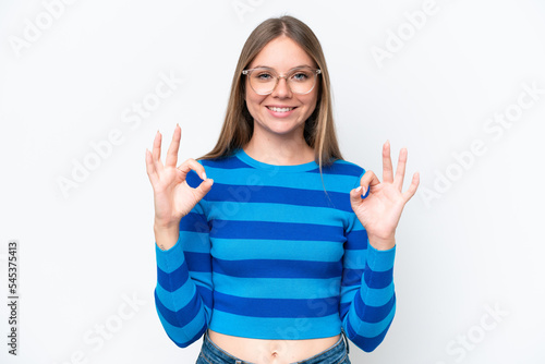Young beautiful blonde woman isolated on white background showing ok sign with two hands