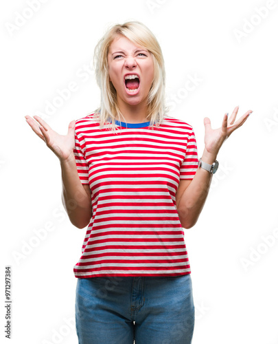 Young beautiful blonde woman over isolated background crazy and mad shouting and yelling with aggressive expression and arms raised. Frustration concept.