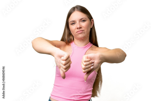 Young beautiful blonde woman over isolated background showing thumb down with two hands