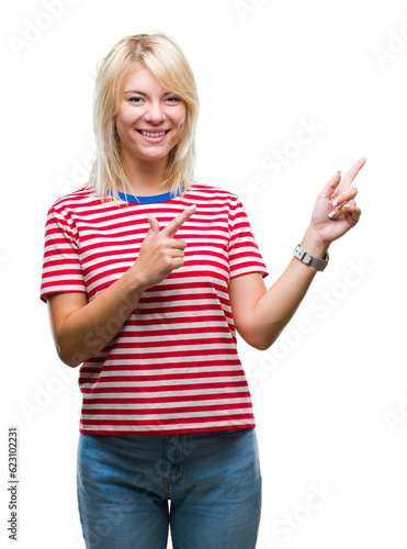 Young beautiful blonde woman over isolated background smiling and looking at the camera pointing with two hands and fingers to the side.