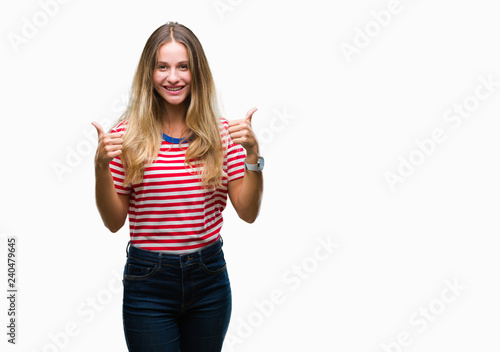 Young beautiful blonde woman over isolated background success sign doing positive gesture with hand, thumbs up smiling and happy. Looking at the camera with cheerful expression, winner gesture.