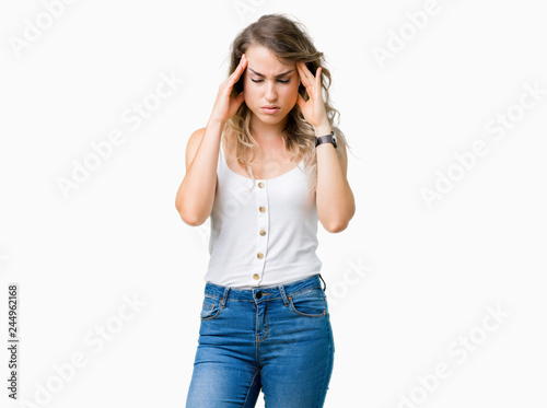 Young beautiful blonde woman over isolated background with hand on head for pain in head because stress. Suffering migraine.
