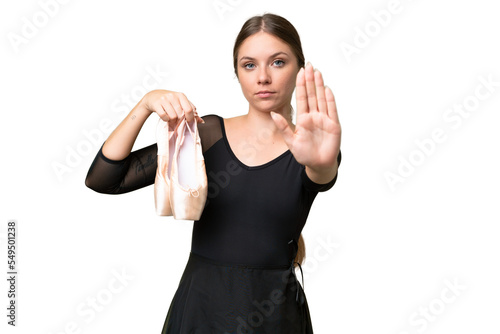 Young beautiful blonde woman practicing ballet over isolated background making stop gesture