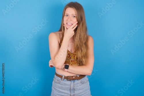 young beautiful blonde woman standing against blue background covering mouth with hands scared from something or someone bitting nails
