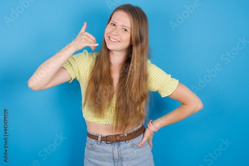 young beautiful blonde woman standing against blue background imitates telephone conversation, makes phone call gesture with hands, has confident expression. Call me!