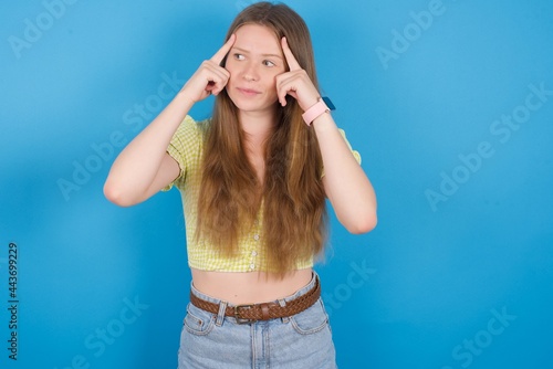 young beautiful blonde woman standing against blue background with thoughtful expression, looks away, keeps hand near face, thinks about something pleasant.