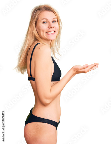 Young beautiful blonde woman wearing bikini pointing aside with hands open palms showing copy space, presenting advertisement smiling excited happy