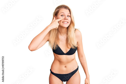 Young beautiful blonde woman wearing bikini pointing with hand finger to face and nose, smiling cheerful. beauty concept