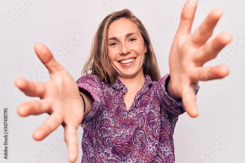 Young beautiful blonde woman wearing boho shirt standing over isolated background looking at the camera smiling with open arms for hug. cheerful expression embracing happiness.