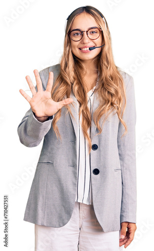 Young beautiful blonde woman wearing call center agent headset showing and pointing up with fingers number five while smiling confident and happy.