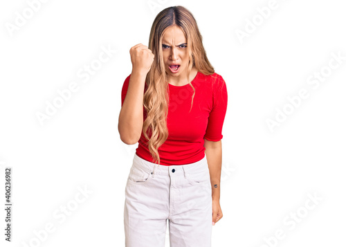 Young beautiful blonde woman wearing casual clothes angry and mad raising fist frustrated and furious while shouting with anger. rage and aggressive concept.