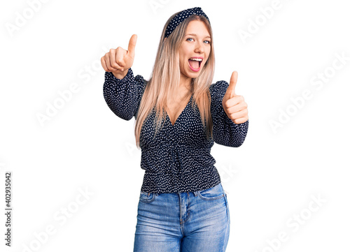 Young beautiful blonde woman wearing casual clothes approving doing positive gesture with hand, thumbs up smiling and happy for success. winner gesture.