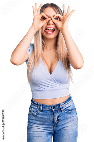 Young beautiful blonde woman wearing casual clothes doing ok gesture like binoculars sticking tongue out, eyes looking through fingers. crazy expression.