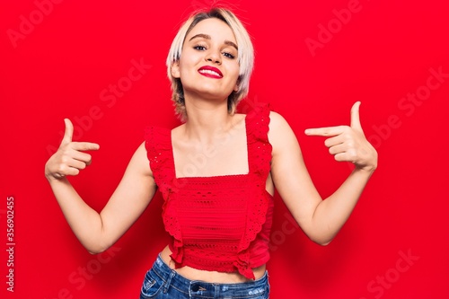Young beautiful blonde woman wearing casual clothes looking confident with smile on face, pointing oneself with fingers proud and happy.