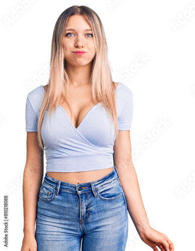 Young beautiful blonde woman wearing casual clothes puffing cheeks with funny face. mouth inflated with air, crazy expression.