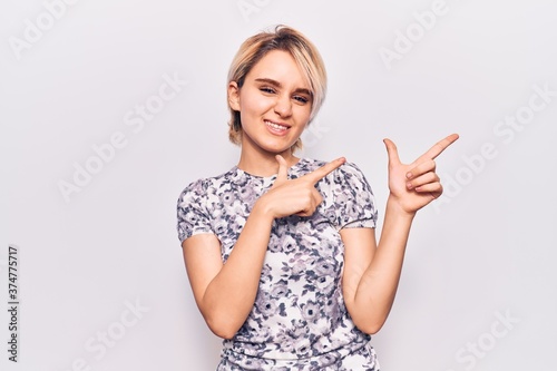 Young beautiful blonde woman wearing casual clothes smiling and looking at the camera pointing with two hands and fingers to the side.