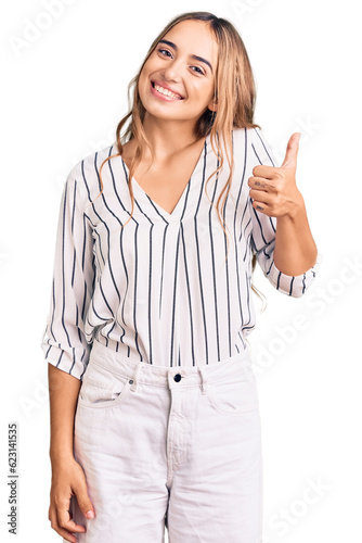 Young beautiful blonde woman wearing casual clothes smiling happy and positive, thumb up doing excellent and approval sign
