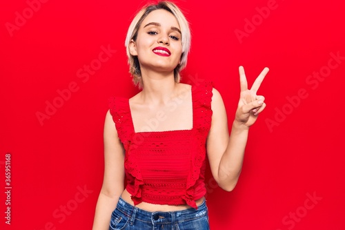 Young beautiful blonde woman wearing casual clothes smiling with happy face winking at the camera doing victory sign. number two.