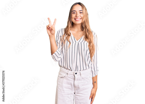 Young beautiful blonde woman wearing casual clothes smiling with happy face winking at the camera doing victory sign. number two.