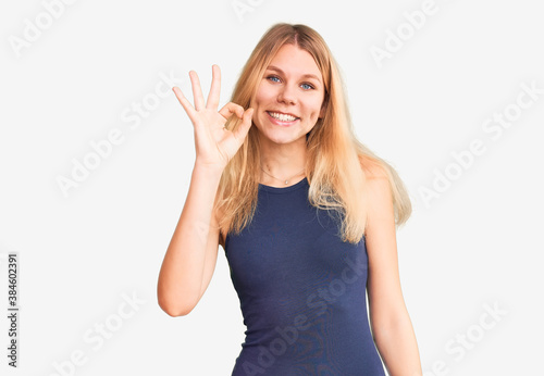 Young beautiful blonde woman wearing casual dress smiling positive doing ok sign with hand and fingers. successful expression.