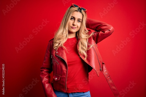 Young beautiful blonde woman wearing casual jacket standing over isolated red background confuse and wonder about question. Uncertain with doubt, thinking with hand on head. Pensive concept.