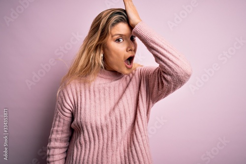 Young beautiful blonde woman wearing casual pink sweater over isolated background surprised with hand on head for mistake, remember error. Forgot, bad memory concept.