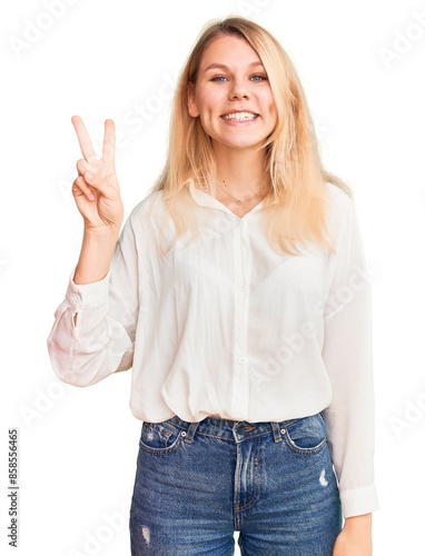 Young beautiful blonde woman wearing casual shirt smiling with happy face winking at the camera doing victory sign. number two.