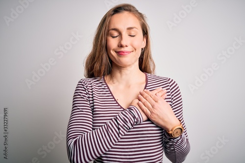 Young beautiful blonde woman wearing casual striped t-shirt over isolated white background smiling with hands on chest with closed eyes and grateful gesture on face. Health concept.