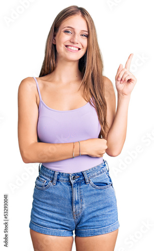 Young beautiful blonde woman wearing casual style with sleeveless shirt smiling happy pointing with hand and finger to the side