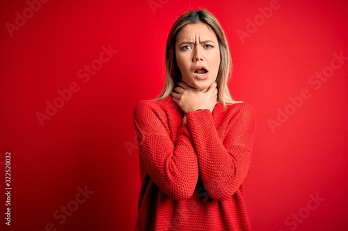 Young beautiful blonde woman wearing casual sweater over red isolated background shouting suffocate because painful strangle. Health problem. Asphyxiate and suicide concept.