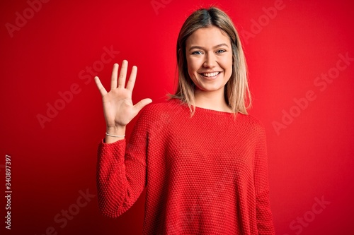 Young beautiful blonde woman wearing casual sweater over red isolated background showing and pointing up with fingers number five while smiling confident and happy.