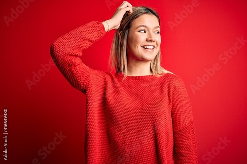 Young beautiful blonde woman wearing casual sweater over red isolated background smiling confident touching hair with hand up gesture, posing attractive and fashionable
