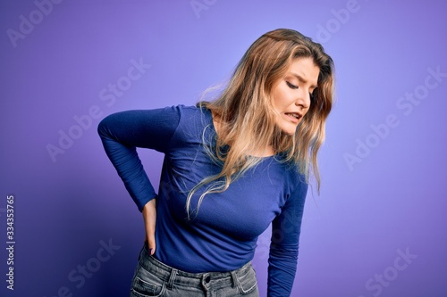 Young beautiful blonde woman wearing casual t-shirt over isolated purple background Suffering of backache, touching back with hand, muscular pain