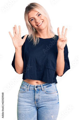 Young beautiful blonde woman wearing casual t-shirt showing and pointing up with fingers number eight while smiling confident and happy.