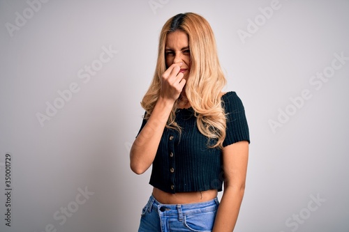 Young beautiful blonde woman wearing casual t-shirt standing over isolated white background smelling something stinky and disgusting, intolerable smell, holding breath with fingers on nose. Bad smell