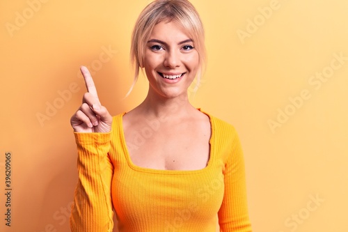 Young beautiful blonde woman wearing casual t-shirt standing over isolated yellow background smiling with an idea or question pointing finger up with happy face, number one