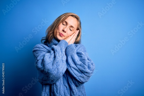 Young beautiful blonde woman wearing casual turtleneck sweater over blue background sleeping tired dreaming and posing with hands together while smiling with closed eyes.